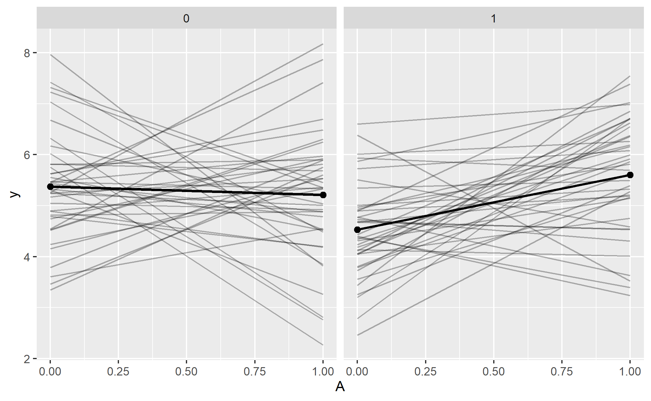 geom_path(data=g, aes(group=B), size=1) + # plot mean lines